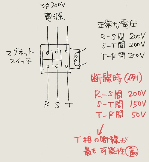 上図の場合、T相の断線の可能性が高い。
