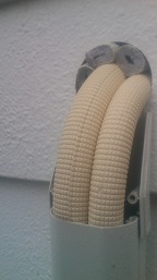 エアコンの配管を収める場合は、ドレーン(排水管)の水の流れを考慮にいれて施工していきます。
