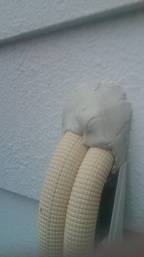 ちなみに外回りの場合は、ダクトの固定には、ステンレスビスを使います。錆びるビスを使ってしまうと、やがて錆びが流出して、壁にタラリと、赤茶の筋がでてきてしまうからです。