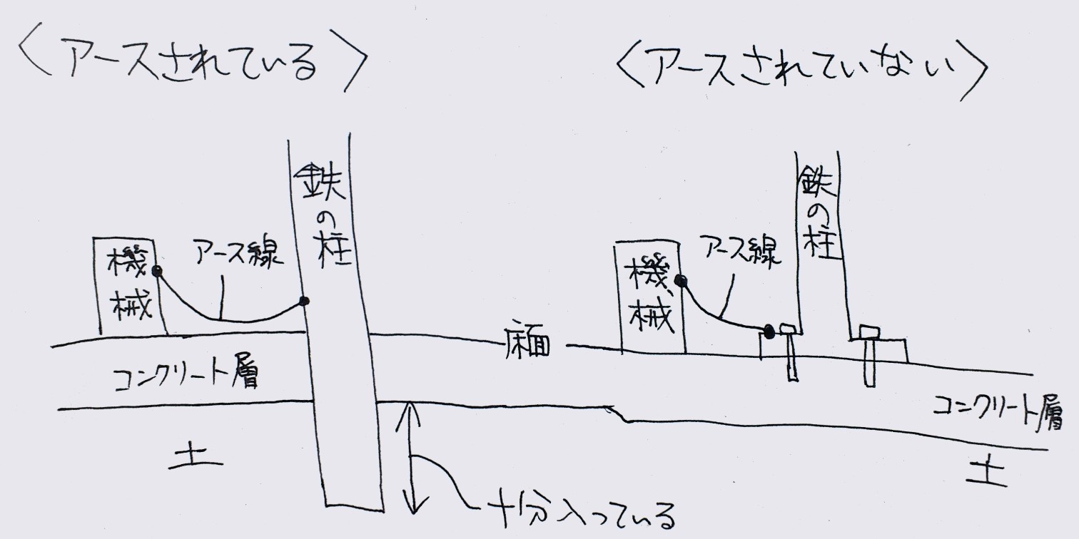 工場の柱だからといってアースされているとは限らない。土まで接しているのはアースされている。だがコンクリアンカーに止めてあるのはアースされていないかもしれない。
