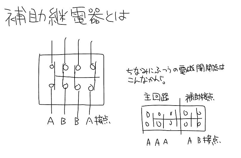 補助継電器というのは、電磁接触器に似ているが、接点構成が違う。一般的な補助継電器は、A接点とB接点が2つずつある。
