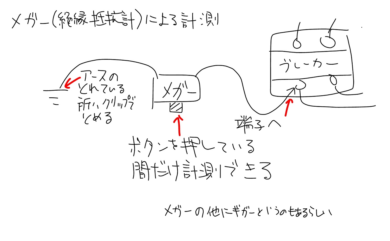 メガーは、漏電がないか、回路がしっかり絶縁されているかどうか調べるのに使います。