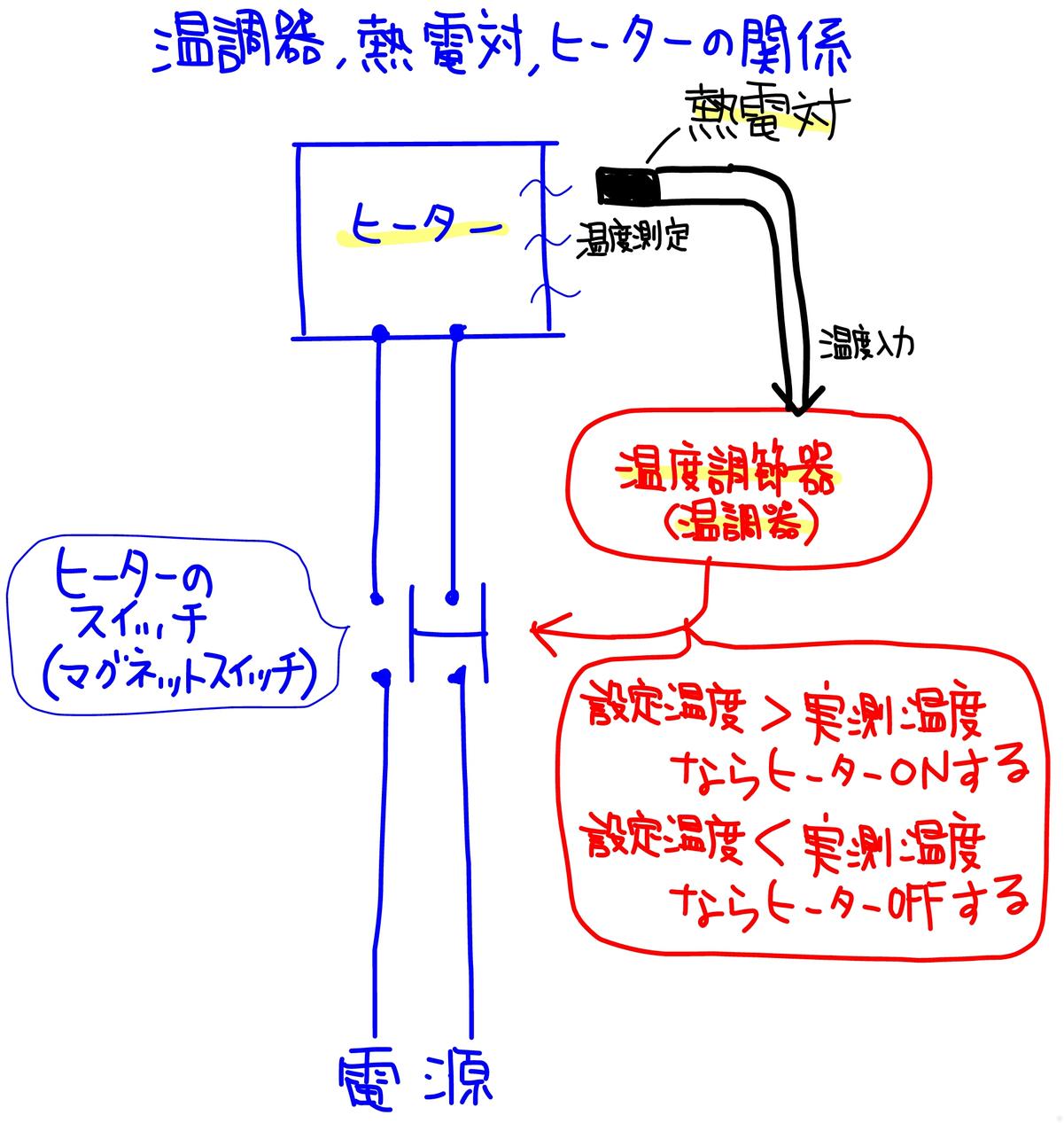 目標温度に達していればヒーターをOFFにし、目標温度を切ったらヒーターをONにする、という具合です。
