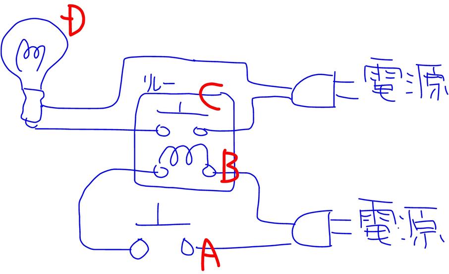Aのボタンを押すと、Bのコイルに電流が流れ、それによってCのスイッチが入り、Dの電球が点灯するわけです。