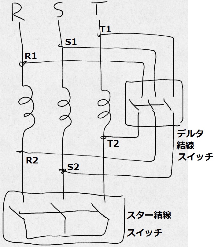 2つのスイッチでスターとデルタを切り替えられる回路の電気理論図は下記の左のようなかんじです。この図を原理図にあてはめてみると下記の右のような感じです。デルタ結線の方が少しわかりにくいかもしれませんが、言われてみればなるほど、という感じではないでしょうか。