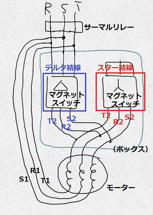 モーター始動の際、まずスター結線のマグネットがONになり、モーターが回って数秒したら、スターのマグネットがOFFになると同時にデルタ結線のマグネットがONになる。
