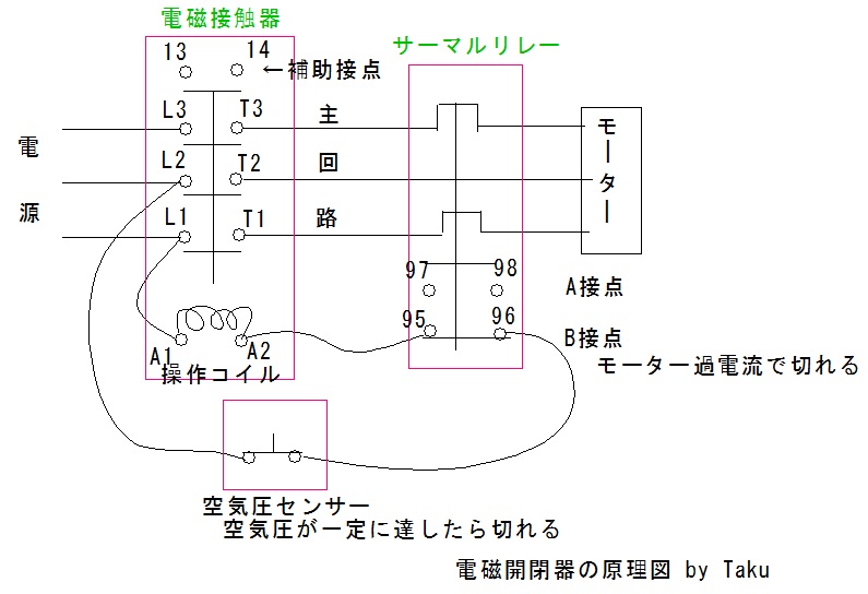 何度か「正しく配線してあれば」と書いたように、ただサーマルリレーをつけるだけでは、サーマルリレーは作動しません。