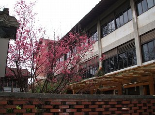 食事のあとは、またしても50ccスクーターの後ろでゆられて数十分、そしてYU姉が以前留学したという、東海大学のキャンパスで散歩。だれでも入れて緑がいっぱいのいいところだった。中に背の高いチャーチがあって結婚式が行なわれていた。そのまわりで恋人たちが時を過ごしていた。校舎は、日本式住居になっていた。どういうのだっけ。今、9ヶ月前のメモを見ながらこれを書いているのでかなり記憶が薄れている・・・。あと大きな図書館もあったかな。あと写真にもあるように、「台湾のサクラ」が咲いていた。