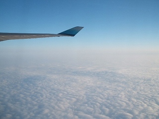 さて、飛行機は木曜夜7時半発。一気に地上がみえなくなる。そして、ついに、昔から、念願の、あこがれの、空で飲むワイン!ごくふつうのワインだったが、喜びつつ飲んだ。機内食は魚だったので、白ワインを。