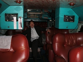 そのバスがすごい!!びっくり。こんなバスはじめて見た。座席が超豪華なのである。赤レザー張りふかふかゆったりシート。マッサージチェアのすわり心地。いくら長距離バスだからってこれはすばらしすぎる。幅が飛行機の座席の2倍はある。
